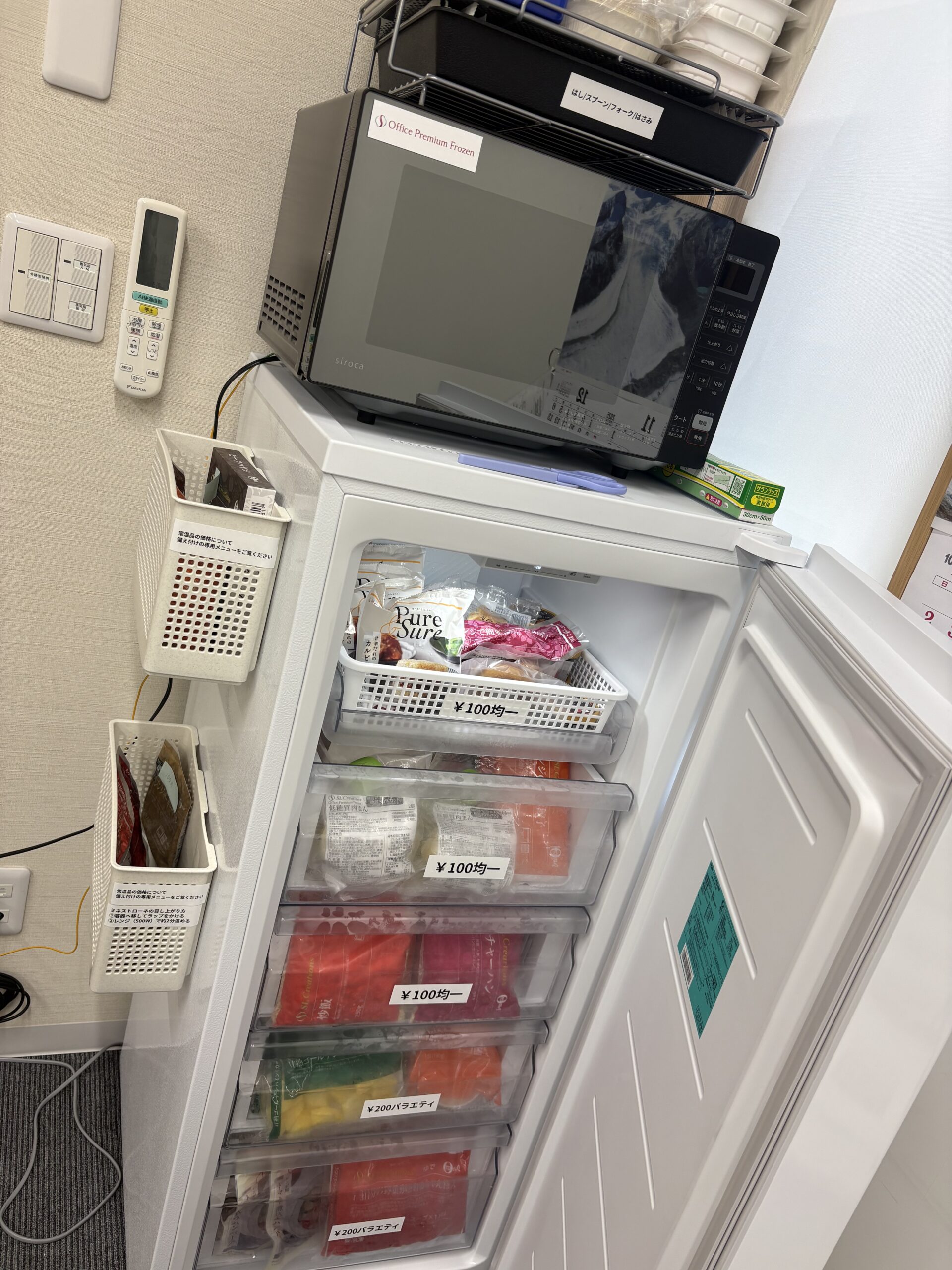 社内に専用の冷凍庫を設置して、様々なメニューの冷凍食品を常備。価格も100~200円と安価!