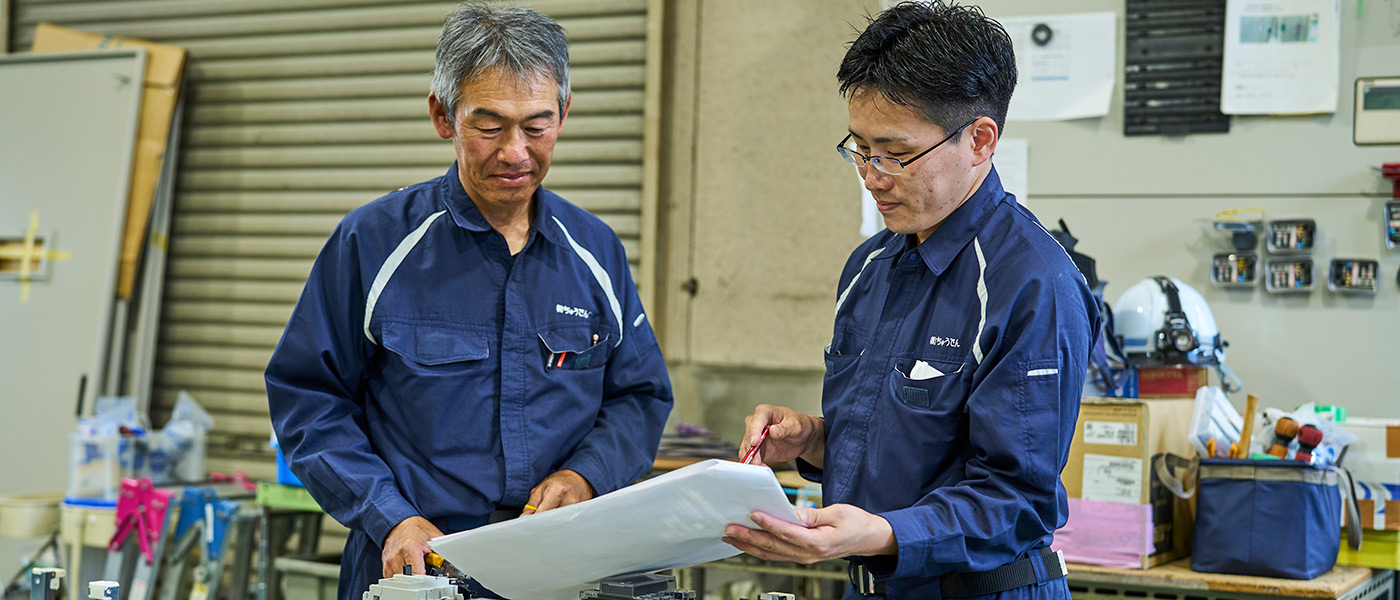 もしも求める条件があるとしたら、できるだけ次のレベルを目指していこうとする“やる気”と、現場の多くの仕事仲間と笑顔でコミュニケーションできる“人柄”です。当社に入社された皆さんは、先輩・後輩に関係なく言いたい事が言い合える社風に驚くことでしょう。社内の円滑なコミュニケーションが電気工事の品質や安全を高めていくので、壁のない人間関係を最も大切にしているのです。質問すれば何でも応えてくれる先輩のもとで、少しずつ成長していってください。